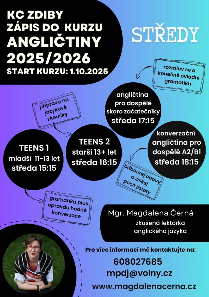 Baví mě být lokální zdibská lektorka a potkávat se v kurzech s lidmi, kteří tady bydlí. Ve školním roce 2025/2026 otevřu nové skupiny podle aktuálního zájmu, některé budou pokračovat.